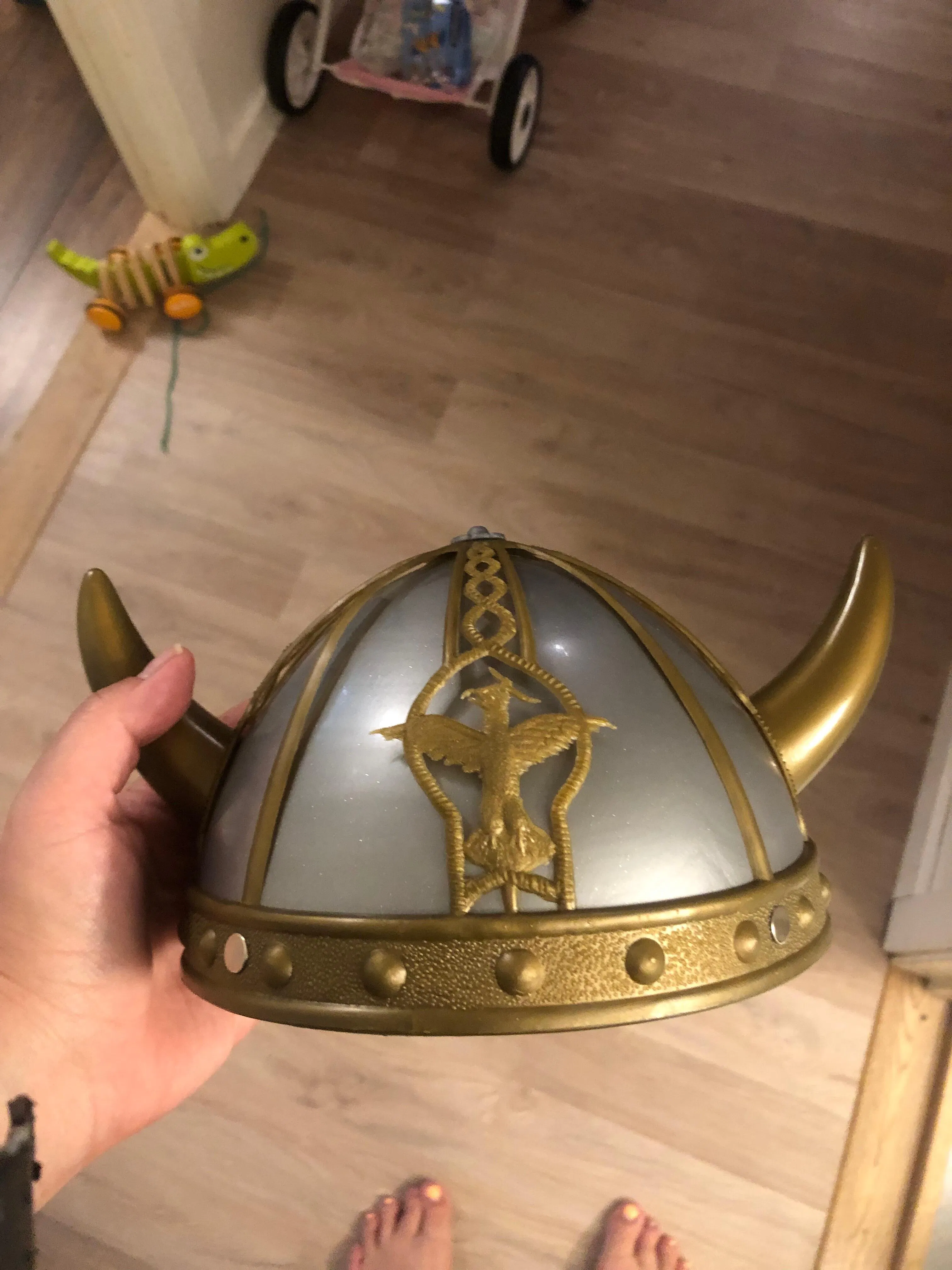Denna vikings hjälm är en fantastisk och rolig accessoar för barn som älskar att leka och klä ut sig. Med justerbara horn som kan vridas runt, ger den ett extra spännande och autentiskt utseende till alla vikingakostymer. Perfekt för temafester, rollspel eller som en del av en fantasifull lekupplevelse. Hjälmen är designad för att ge barn möjlighet att skapa sina egna vikingaäventyr och känns både stilren och funktionell.